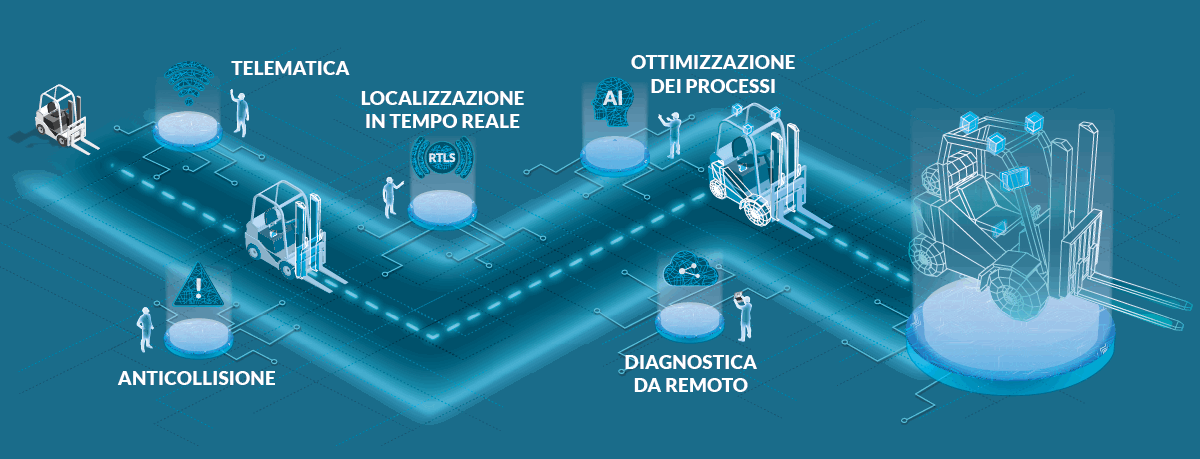 Ubiquicom Forklift Ecosystem è un sistema integrato di soluzioni avanzate incentrate sulla movimentazione dei carichi a opera dei carrelli elevatori, capace di rispondere a 5 esigenze fondamentali per la logistica: localizzazione, efficienza operativa, sicurezza, telematica e diagnostica da remoto.